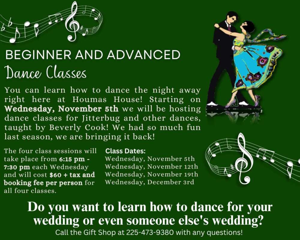 You can learn how to dance the night away right here at Houmas House! Starting on Wednesday, November 5th we will be hosting dance classes for Jitterbug and other dances, taught by Beverly Cook! We had so much fun last season, we are bringing it back! The four class sessions will take place from 6:15 pm – 7:30 pm each Wednesday and will cost $60 + tax and booking fee per person for all four classes. Class Dates: |