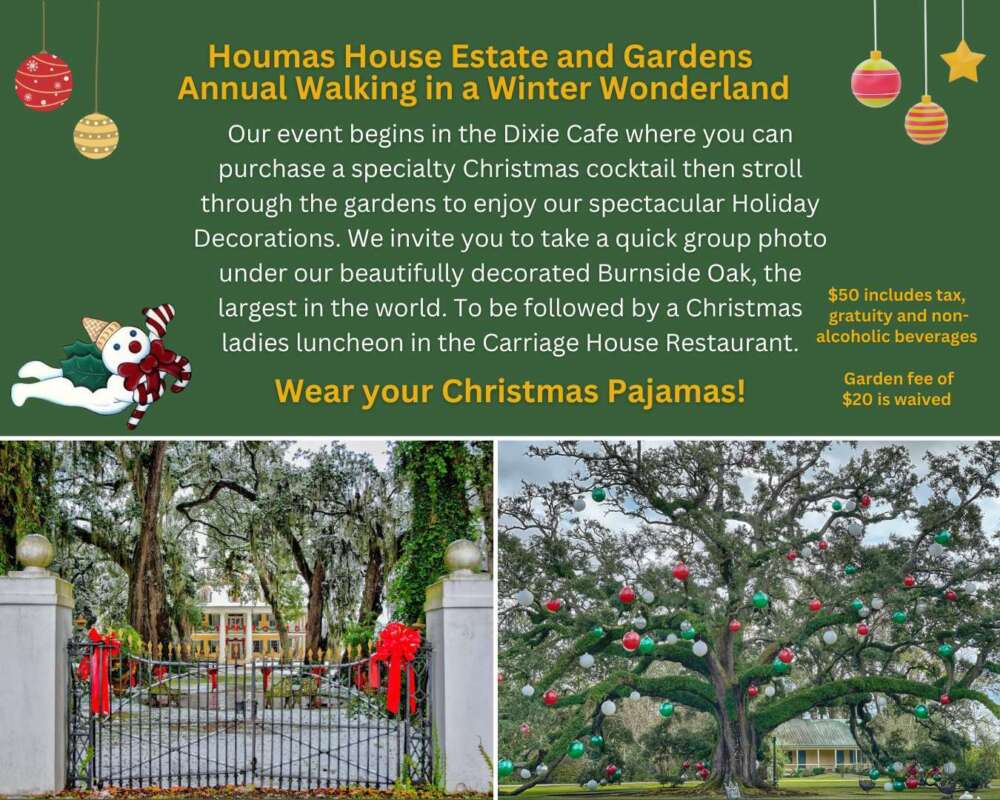 Our event begins in the Dixie Cafe where you can purchase a specialty Christmas cocktail then stroll through the gardens to enjoy our spectacular Holiday Decorations. We invite you to take a quick group photo under our beautifully decorated Burnside Oak, the largest in the world. To be followed by a Christmas ladies luncheon in the Carriage House Restaurant. Wear your Christmas Pajamas! Saturday, December 13, 2025 at Sunday, December 14, 2025 at