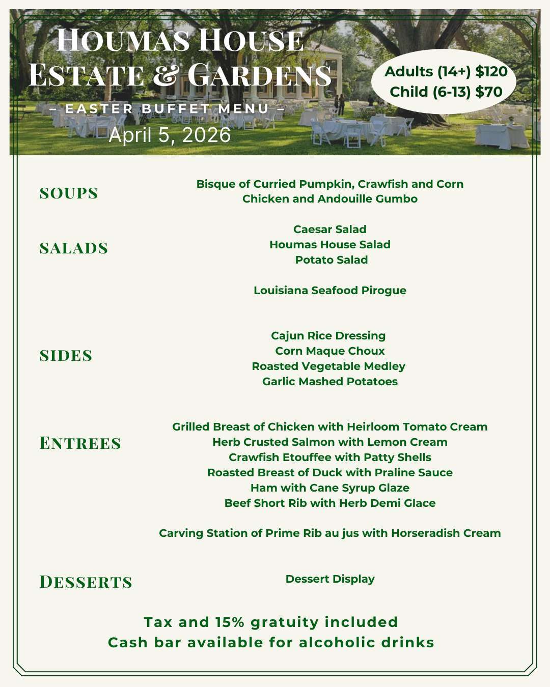 Join us on Easter Sunday for our Annual Easter Buffet on April 5, 2026, from 11:00 AM to 2:00 PM. Enjoy a delicious array of offerings, thoughtfully prepared dishes for the whole family to enjoy. Guests may state their preference for seating in the charming Pavilion Courtyard or inside the elegant Pavilion Ballroom, creating the perfect setting for a memorable Easter celebration. To make reservations call the gift shop at 225-473-9380! |